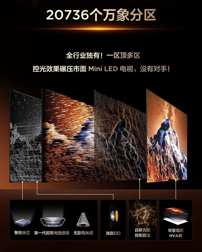 此外,X11L还实现了分区和亮度上的“双巅峰”突破。在相同的成本下,SQD-Mini LED技术可以使用更多的背光灯珠,从而达到更高的分区和更高的亮度。X11L拥有20000+级万象分区,在“一区顶多区”的加持下,带来了极致的控光精度,让星空的黑与星点的光明暗分明,彻底告别光晕干扰。亮度上,X11L搭载绚彩XDR10000nits峰值亮度,确保在播放顶级HDR片源时,实现从阳光刺眼到烛光微暖的1:1动态范围真实还原,且亮度持久稳定。